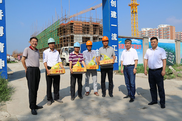 8月8日上午,烈日當(dāng)頭,酷暑難耐,在東辛農(nóng)場有限公司銀羽住宅新區(qū)供電線路鋪設(shè)現(xiàn)場,集團(tuán)公司工會主席佟曉廷一行在東辛黨委書記韓中書、紀(jì)委書記王緒國、