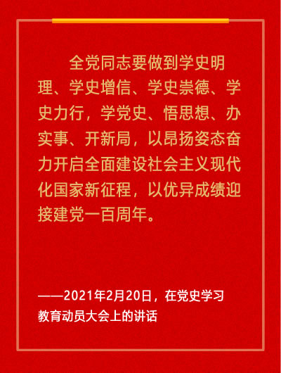 馬克思主義政黨的先進(jìn)性,首先體現(xiàn)為思想理論上的先進(jìn)。百年來,我們黨之所以能不負(fù)歷史和人民重托,闖過重重險關(guān),關(guān)鍵在于堅持理論和實踐相結(jié)合,不斷用科學(xué)理論指導(dǎo)偉大實踐。習(xí)近平新時代中國特色社會主義思想是當(dāng)代中國馬克思主義、21世紀(jì)馬克思主義。用這一科學(xué)理論武裝頭腦、指導(dǎo)實踐、推動工作,是最大的政治任務(wù)。在黨史學(xué)習(xí)教育中,黨員干部必須在學(xué)懂弄通做實習(xí)近平新時代中國特色社會主義思想上狠下功夫,不斷深化對這一黨的創(chuàng)新理論的精神實質(zhì)和豐富內(nèi)涵的認(rèn)識,堅持學(xué)思用貫通、知信行統(tǒng)一,堅持不懈用習(xí)近平新時代中國特色社會主義思想武裝頭腦、指導(dǎo)實踐、推動工作。要在學(xué)習(xí)中努力追求進(jìn)步提升。自我滿足無疑是學(xué)習(xí)最大的敵人,要學(xué)有所成,就必須永不自滿。要堅決糾正對理論學(xué)習(xí)不重視、把理論學(xué)習(xí)當(dāng)任務(wù)等不良學(xué)習(xí)態(tài)度,堅決克服理論學(xué)習(xí)淺嘗輒止、不求甚解等問題,堅決防范學(xué)用脫節(jié)、學(xué)習(xí)碎片化隨意化等現(xiàn)象,不斷提高理論素養(yǎng)、政治素養(yǎng),提升運用黨的創(chuàng)新理論推動工作、解決問題的能力。要在學(xué)習(xí)中進(jìn)一步樹立創(chuàng)新突破意識。好學(xué)才能上進(jìn)。中國共產(chǎn)黨人依靠學(xué)習(xí)走到今天,也必然要依靠學(xué)習(xí)走向未來。在新時代,如果我們的思想還停留在過去,那么,看問