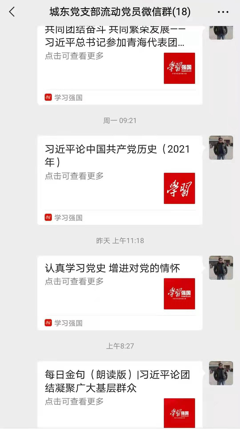 “我作為黨支部書記,作為黨史學習教育的第一責任人,每天都將學習內(nèi)容發(fā)送至流動黨員微信群,對流動黨員的學習需求和方向進行及時跟蹤,確保流動黨員不流失,一個不掉隊……”城東黨支部書記邱金龍介紹。