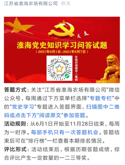 淮海農(nóng)場(chǎng)公司黨委工作部將在每周一通過(guò)農(nóng)場(chǎng)公司微信公眾號(hào)平臺(tái)發(fā)布當(dāng)周黨史學(xué)習(xí)教育答卷考題,分別以單選、多選、對(duì)錯(cuò)題型出現(xiàn),讓大家在參與中,回顧黨的光輝歷程,謳歌黨的豐功偉績(jī),為推動(dòng)淮海高質(zhì)量發(fā)展提供有力保障。據(jù)悉,每部手機(jī)只有一次答題機(jī)會(huì)。答題結(jié)束后可以在“排行榜”一欄查看自己當(dāng)期在本周本時(shí)段的排名。答題方式:關(guān)注“淮海微信公眾號(hào)”,每周通過(guò)下方菜單欄進(jìn)入本周答題頁(yè)面進(jìn)行答題?;顒?dòng)獎(jiǎng)勵(lì):將根據(jù)答題成績(jī)和參賽人員數(shù)量,最張產(chǎn)生出一定數(shù)量的一二三等獎(jiǎng)。