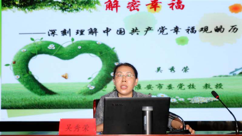 淮安市委黨校副教育長、教授吳秀榮應邀到場為廣大黨員職工作《解密幸福--深刻理解中國共產黨幸福觀的歷史演進》專題宣講。“我們黨的百年歷史,就是一部踐行黨的初心使命的歷史,就是一部黨與人民心連心、同呼吸、共命運的歷史?!毙v以習近平總書記講話為開篇,依次從幸福的本質、中國共產黨幸福觀歷史演進、中國共產黨的成功原因剖析三個方面逐層推進,著重從物質生活和精神生活相統(tǒng)一、享受相統(tǒng)一、個人幸福和集體幸福的統(tǒng)一分析了中國共產黨幸福觀歷史演進,剖析了中國共產黨成功的原因,宣講還從四個方面詳細闡述了習近平的幸福觀:傳承和發(fā)展了馬克思主義幸福觀、創(chuàng)新和超越了中國傳統(tǒng)幸福觀、激蕩了個人層面的奮斗精神、彰顯了領導層面的擔當氣派。宣講最后以“幸福,不僅僅是名詞;幸福,更是動詞﹍﹍”為結尾,給人啟迪,發(fā)人深思。