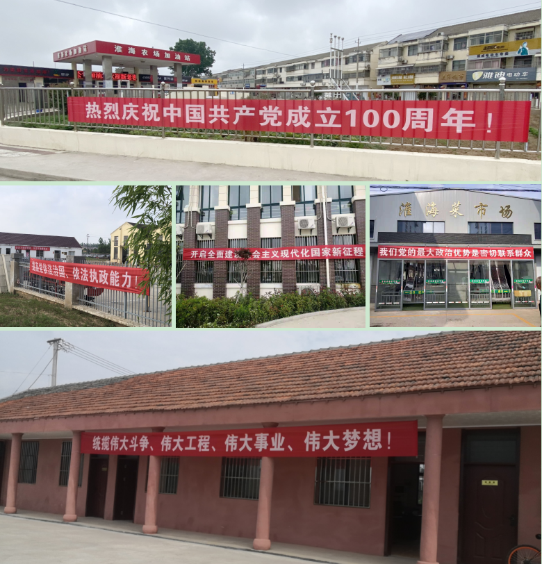“七一”期間,無(wú)論是在淮海農(nóng)場(chǎng)場(chǎng)部小城鎮(zhèn),還是各分場(chǎng)社區(qū)或是二三產(chǎn)單位,我們?cè)?/span>這些單位,總會(huì)看到那一抹“中國(guó)紅”,這些黨史學(xué)習(xí)教育的文字橫幅,成為淮海農(nóng)場(chǎng)靚麗的風(fēng)景線,振奮著人心,激勵(lì)著人們向前向前永向前。