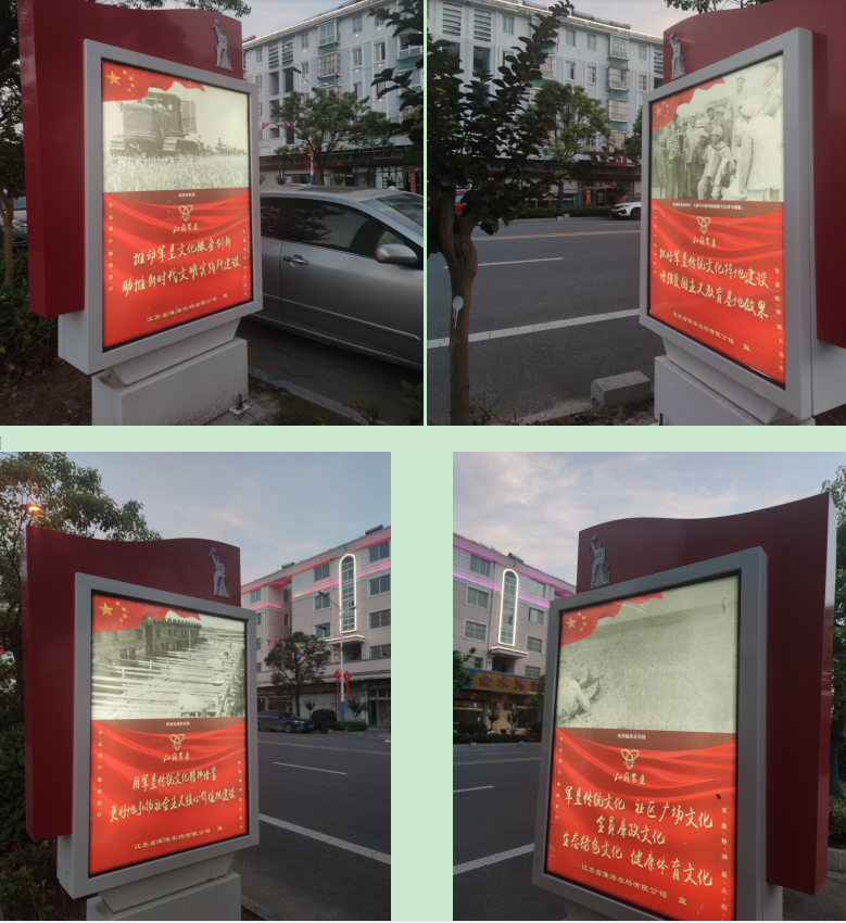 這些燈箱中,廣告燈箱的一面看到統(tǒng)一印制的建黨百年歷史的畫面外,在燈箱的另一面,除了印制江蘇農(nóng)墾統(tǒng)一的LG標(biāo)識和“不忘初心 繼續(xù)前行”“軍墾精神 薪火相傳”的細(xì)小字體外,還分別印有農(nóng)建四師將士在農(nóng)場“三大戰(zhàn)役”進(jìn)程中開墾建設(shè)的不同老照片附說明,印有不同風(fēng)格的軍墾傳統(tǒng)文化標(biāo)語,并在畫面外的框架上,安裝了鑲嵌在其上的軍墾傳統(tǒng)文化的標(biāo)志,濃郁的軍墾傳統(tǒng)文化在廣告燈箱中的完美組合,讓仍健在的老軍墾們甚是激動,說農(nóng)場黨委以這種方式宣傳弘揚(yáng)軍墾傳統(tǒng)文化,這是對他們建設(shè)農(nóng)場最好的肯定。