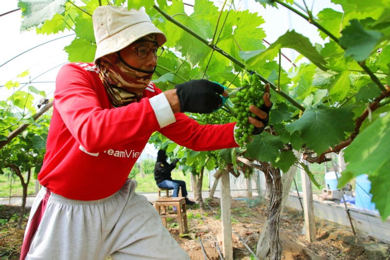 連日來,江心沙農(nóng)場果農(nóng)在葡萄園忙著疏果作業(yè),根據(jù)坐果率高低剪掉病蟲果、裂果、日灼果、畸形果等,選留大小一致、向外排列整齊的果子,做到密度適中、串型合理,確保采摘時(shí)高產(chǎn)與優(yōu)質(zhì)并舉。