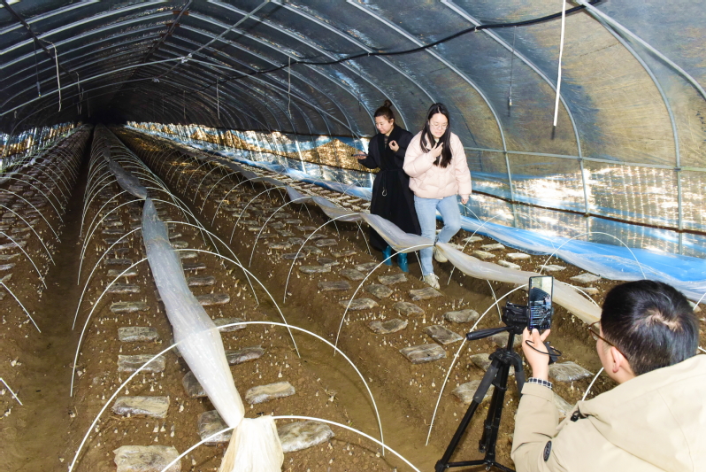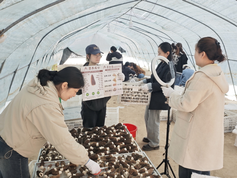 3月11日下午,淮海農(nóng)場新媒體直播間主播助播深入農(nóng)場產(chǎn)業(yè)發(fā)展菌菇種植基地,開展生產(chǎn)流程直播助農(nóng)活動,為即將上市的“墾一代”羊肚菌造勢,貢獻青春力量。圖為主播助播正在大棚內(nèi)直播。